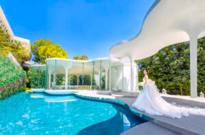 樹々の緑に包まれ、輝く水面に浮かぶように佇む純白のチャペルとなっております