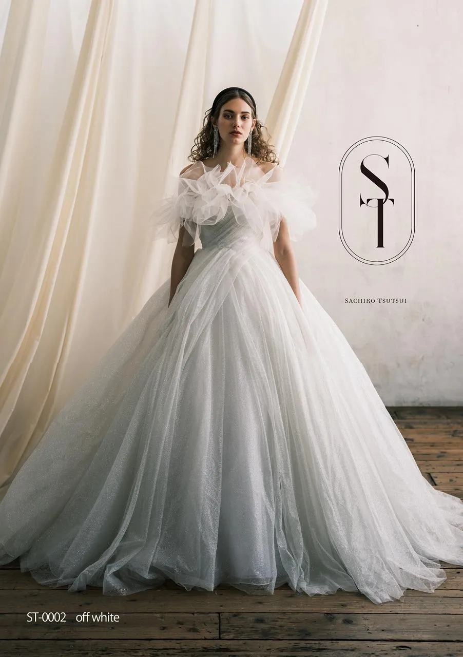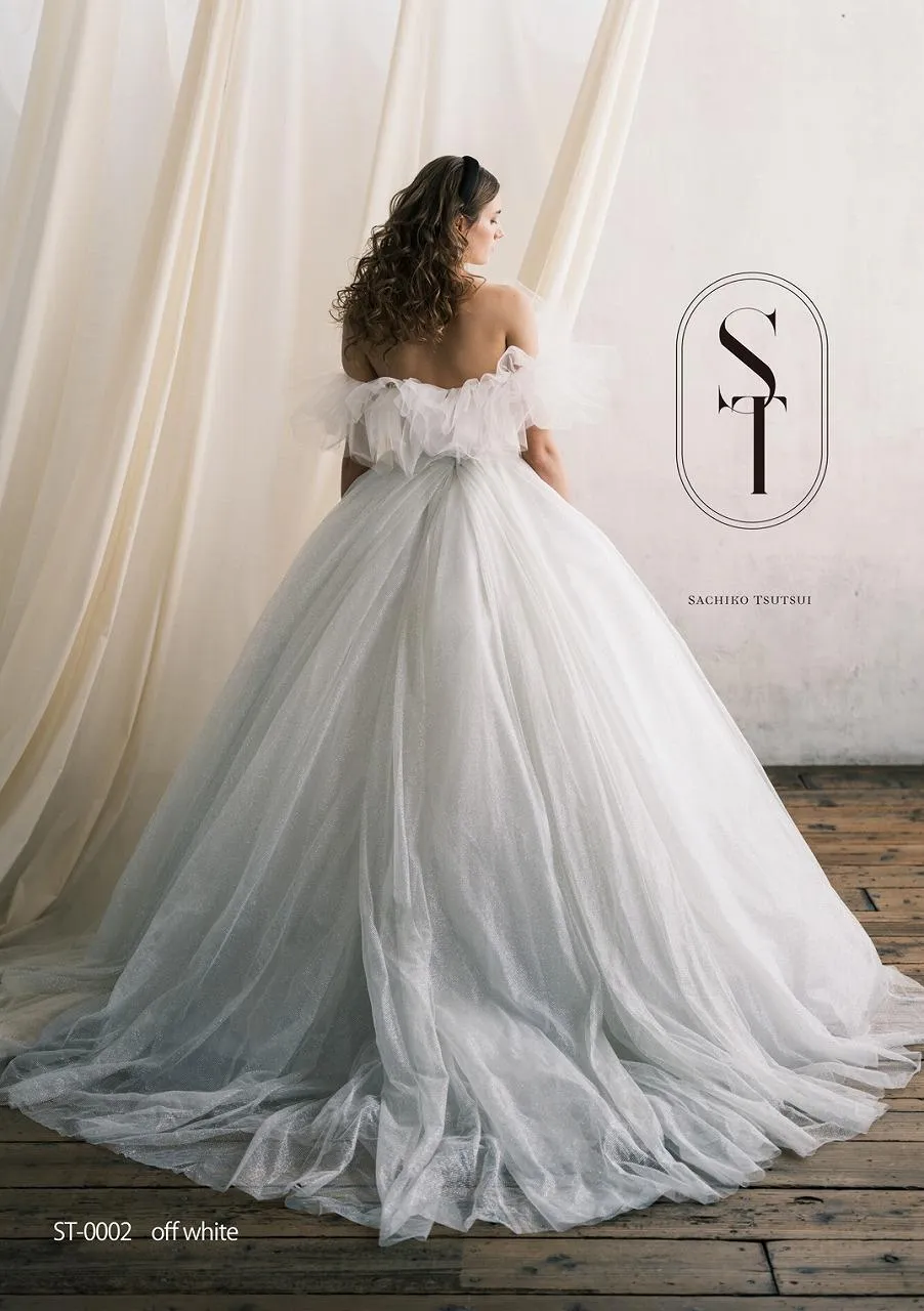 フワフワしたチュールフリルのオフショルダーは、取り外し可能なので、ガラリと印象を変えることが出来ます!