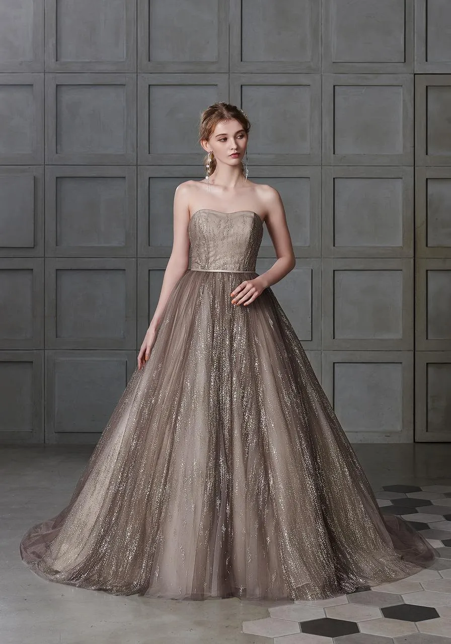 ソフトAラインのシルエットでブラウンとベージュのニュアンスカラードレスです🌸