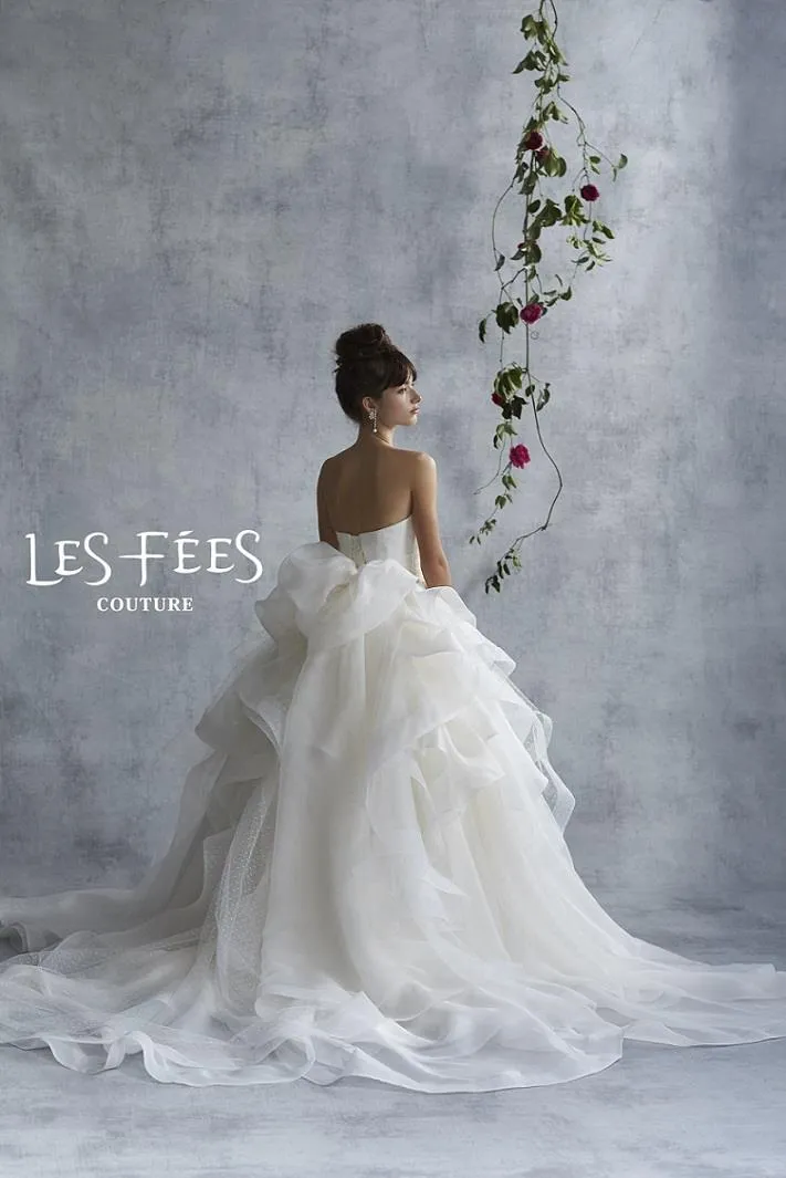バックスタイルは、イタリアのドットチュールやオーガンジー、ブライトチュールなど数種類の生地を組み合わせた、オブジェのようなトレーンが印象的なドレスです✨