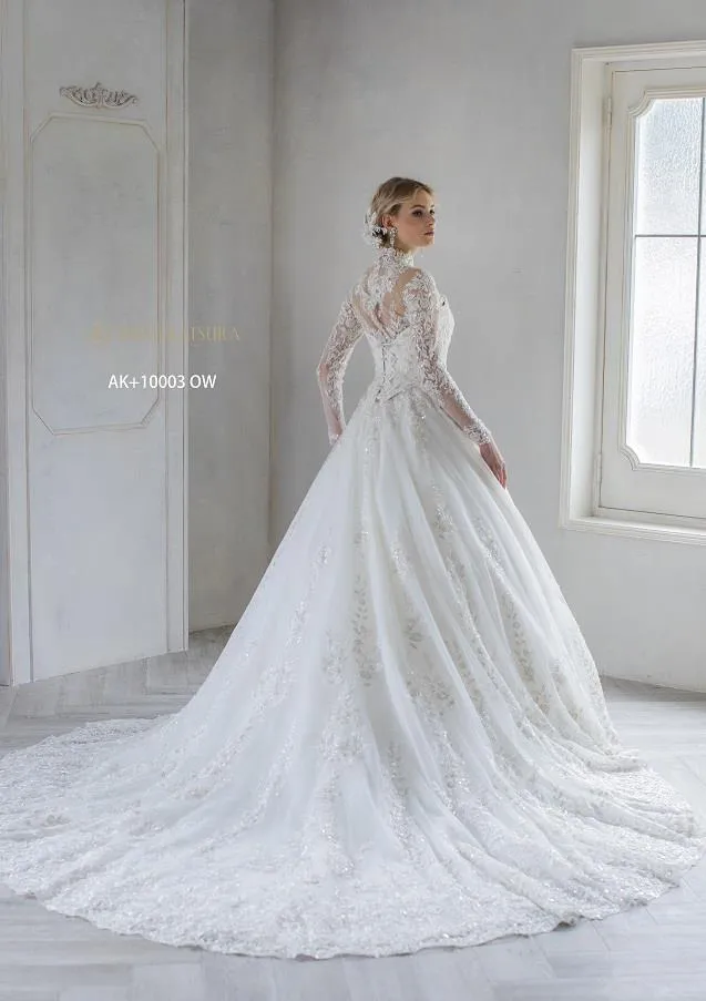 ビーズとスパンコールを隙間なく刺繍し、光輝くビーディングレースがシンプルなシルエットに映えるマリエ。